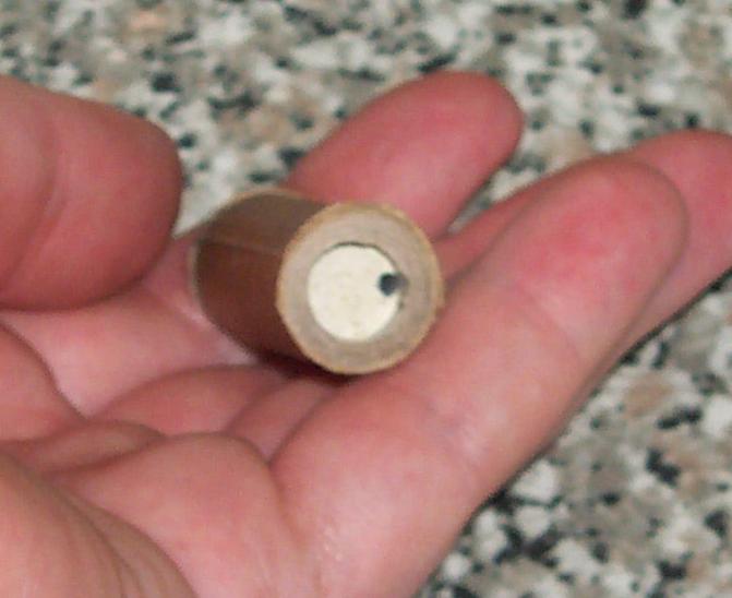 I ram the rockets bulkhead first. The nipple forming a small recess in the top of the casing which is useful when coupling the motor to payloads. I have a special scoop which measures the clay and propellant increments. The bulkhead and nozzle each take one scoop of granulated clay. The propellant grain takes four scoops, each rammed solidly in place before the next is added. The last two scoops of propellant and clay are much easier to load when using a case extender.