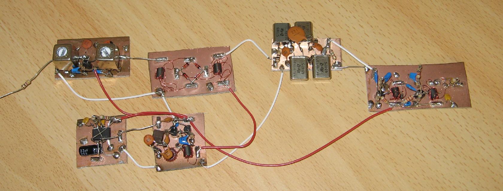 I built a similar VFO to JF1OZL, but I added a buffer to improve stability and drive capability. My timebase is essentially identical. My crystal filter is shorter, only 4 crystals at 11.98 MHz, and my IF amplifier is completely different. I did not have the TV IF chip that JF1OZL uses, so I built a two-stage RF amplifier using BF199s and ferrite bead collector 9:1 transformers.