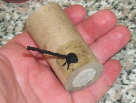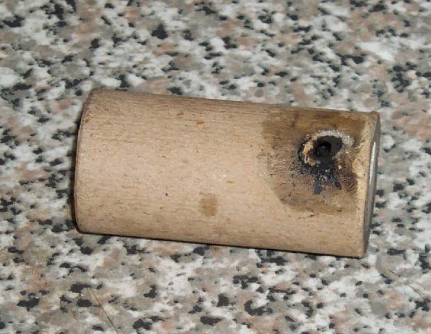 Built like a hummer from an off-cut of 19 mm ID tube, about 50 mm long. End plugs of wax treated cat litter, 4 mm spin vent and case wall treated with waterglass.