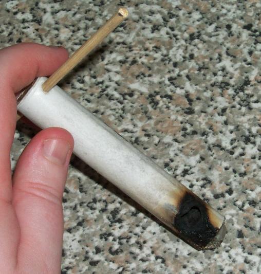 Three helicopter devices, each of a different ID to test various design parameters. Each was charged with straight meal propellant, hot-melt and wadding end plugs, and meal-NC primed blackmatch fuses covered with a little masking tape to allow reliable ignition on wet ground. All had a 45 degree down thrust vector, 1.8 mm nozzle holes for the 5 mm and 8 mm ID devices, 2.5 mm for the 12.5 mm ID device.