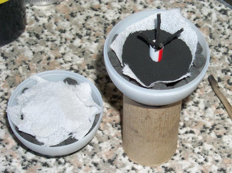 The shell was filled with my experimental KP/Zinc stars, each pumped to 5 mm diameter and length, meal primed. The burst was largely -20+40 mesh pulverone, but I added some -40 mesh pulverone to make the shell slightly over-full for tight packing.
