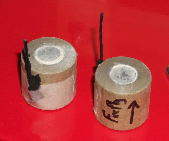 Standard 25 mm long, 12.5 mm ID thick walled hummer tube. Wax threated clay end plugs, 1.8 mm vent hole, tangental and pointed down at 45 degrees. Fused with thin blackmatch and meal-NC paste.