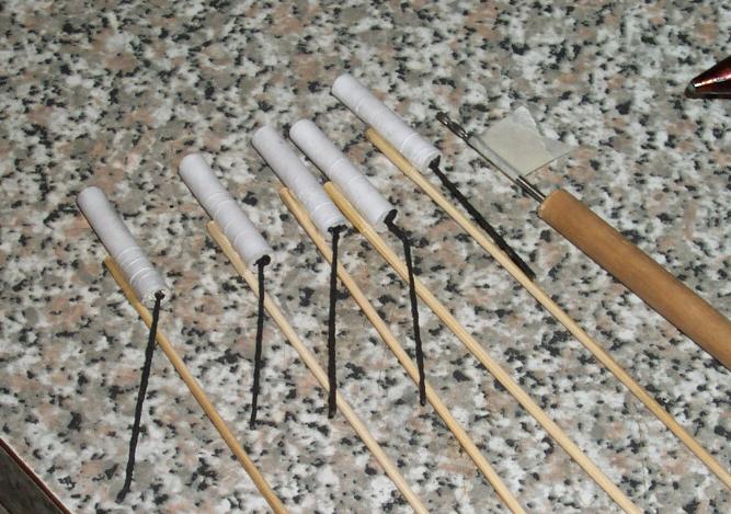 A bamboo kebab stick was glued on as a stabiliser. The rockets were fused with thin blackmatch glued in place with some meal-NC priming paste.