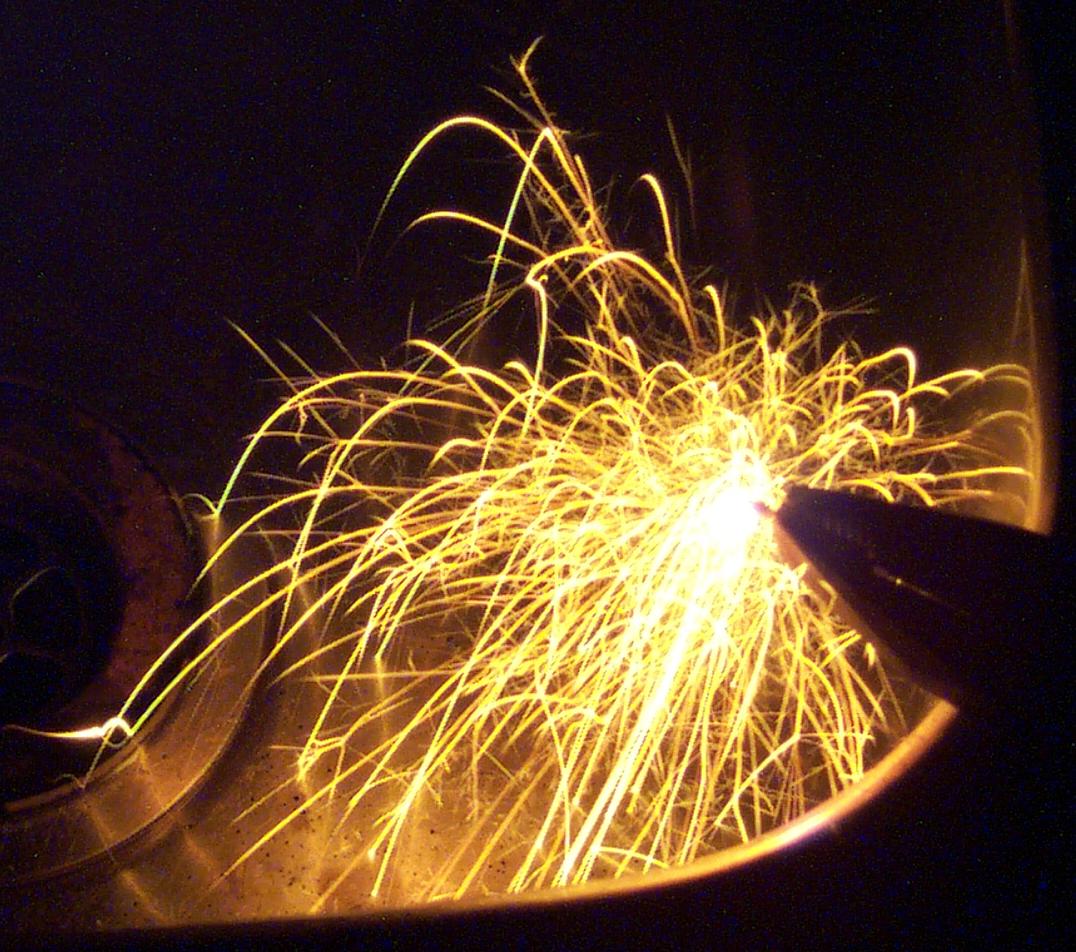 Many of the brighter trails of sparks are seen changing direction as a result of smaller masses ejected at high speed. The fine streaks of the small explosive events during fall make a lace-like effect on some sparks. Many sparks are even seen to explode completely into numerous smaller sparks which fan out in every direction.