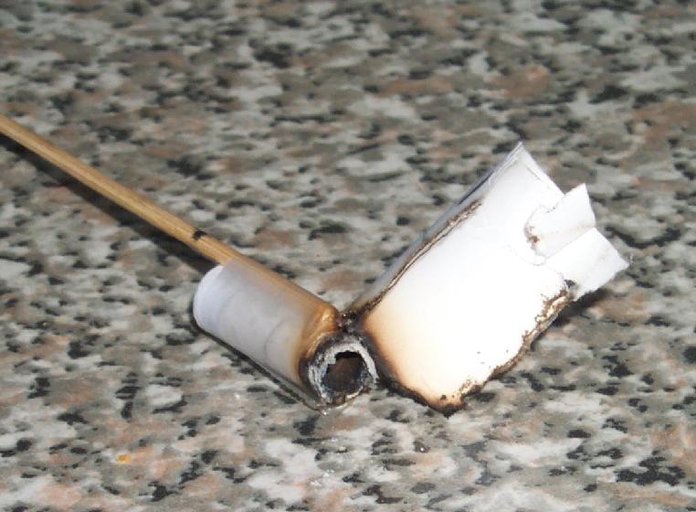Standard bamboo kebab stick stabilizer, not painted as I didn't expect to recover the rocket if it worked well. It was however labeled seperately from the motor (as always) in case of a CATO seperating the stick from the motor.