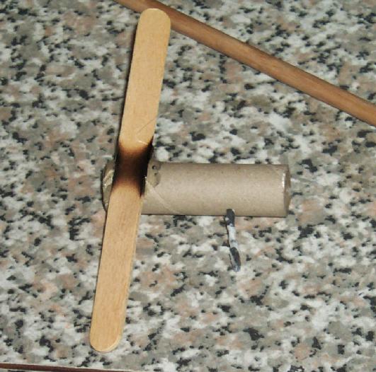 A 3 mm diameter hole was made at one end, fused with a meal-NC tissue paper fuse. A rotor was made by gently heating a paddle-pop stick in the middle over my alcohol burner and twisting. It was hot-melt glued with to the end opposite the fuse-hole.