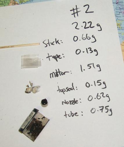 Plaster of Paris nozzle, bulkhead was paper wadding. Casing was cardboard from a matchbox sleeve taped around drift. Same propellant and fuse as all 'Small Experimental Greenmix Rocket', KNO3 75 parts, C 15 parts, S 10 parts, each finely ground and then mixed well.