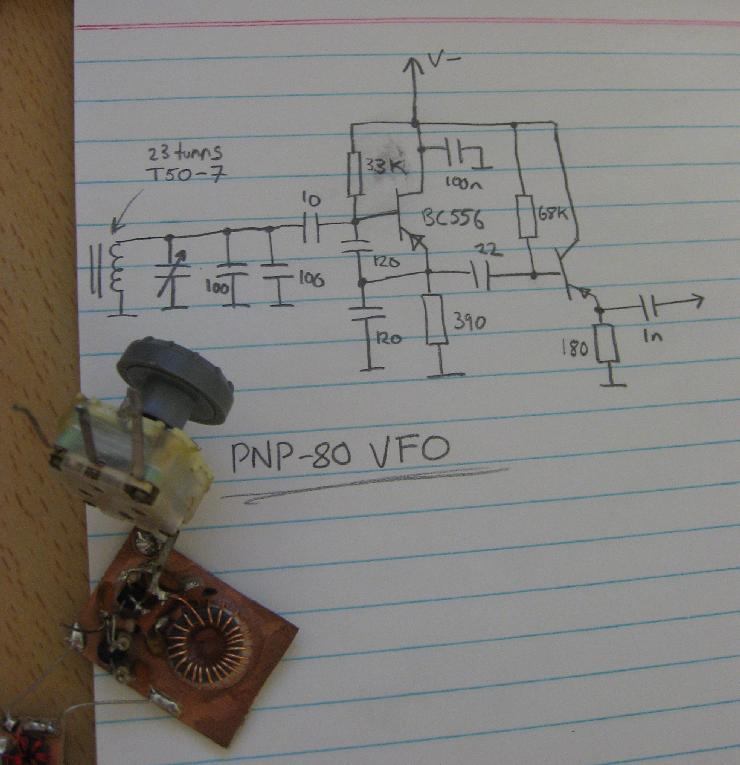 Like most RF experimenters I tend to be an NPN-bigot, never giving the humble PNP devices much of a second look, except perhaps in symmetric AF output stages. I think we look at our circuit diagrams as if electrons had a sense of gravity at times. PNPs are very easy to work with, the simplest way to port a NPN circuit to PNP is to just swap the supply voltage around and change out the devices. I've taken this approach. The diagram is not drawn conventionally, down is positive in this circuit, but you get used to that quite quickly. Although you will likely forget at some point during the construction and connect your PSU's -ve rail to the ground plane and smoke something (if you haven't got a limiting supply). I had one close call during construction when I installed the AF amplifier emitter bypass capacitors the wrong way round and was wondering why the circuit sounded awful and was suddenly drawing so much current.
