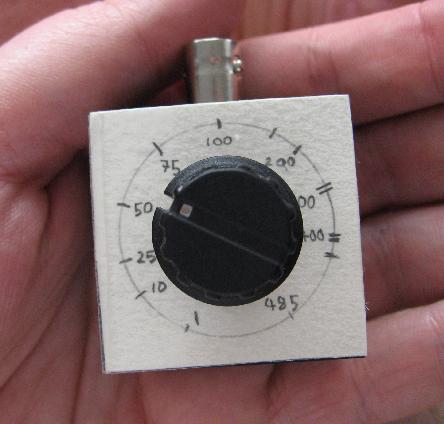 That's about as simple as it comes, a pot in a box with a BNC socket. The calibrated scale is just a piece of cardboard that has been laminated and backed with adhesive using my XYLs Xyron 510 machine. This has proved to be a very good way to make dials for homebrew gear.