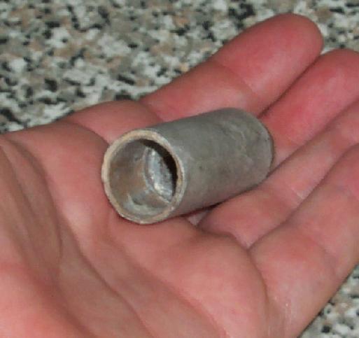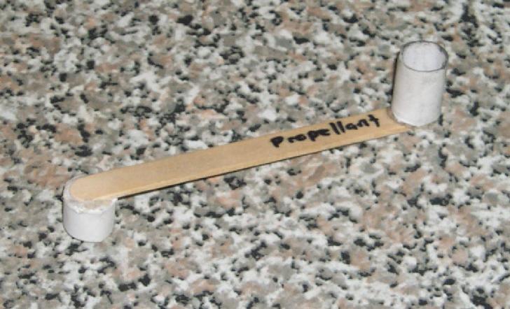 I ram the rockets bulkhead first. The nipple forming a small recess in the top of the casing which is useful when coupling the motor to payloads. I have a special scoop which measures the clay and propellant increments. The bulkhead and nozzle each take one scoop of granulated clay. The propellant grain takes four scoops, each rammed solidly in place before the next is added. The last two scoops of propellant and clay are much easier to load when using a case extender.