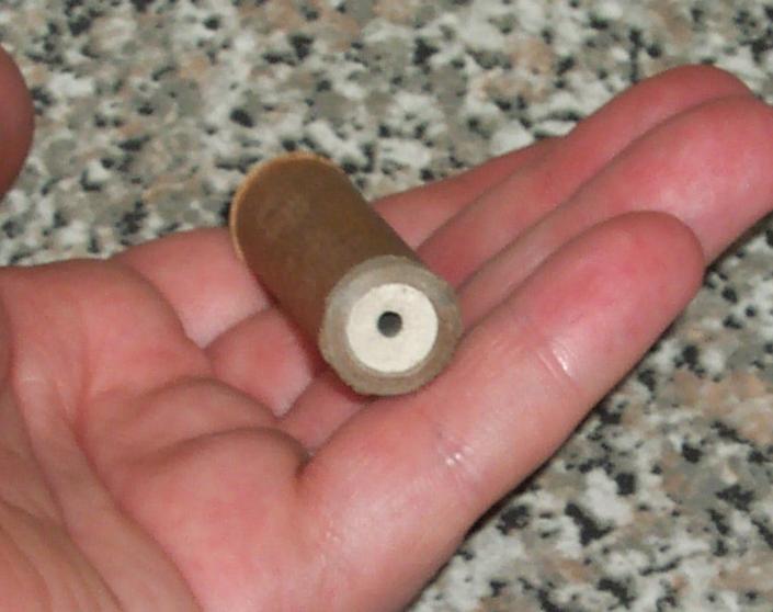 The nozzle and bulkhead plug are pulverized cat litter. I treat my cat litter with 5-10% tea-light candle wax to reduce crumbling. The wax is dissolved in petroleum spirit (shellite, naphtha, etc) and distributed throughout the clay, then the solvent is left to evaporate. The clay is also granulated slightly to simplify loading. This whole clay treatment process is also not 100% required, but helps as the passfire to the payload and the core are drilled out rather than formed with a mandrel while ramming (drilling tends to break up the surface of dry cat litter - but the damage is largely cosmetic).