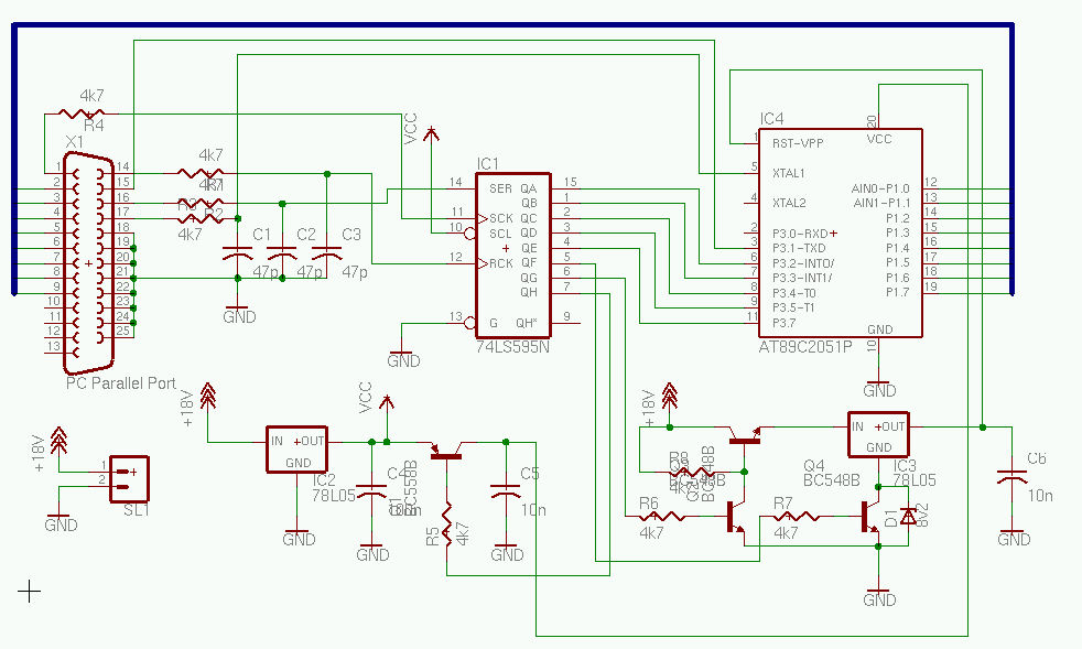 I developed this design from scratch to be a cheap and easy to put together programmer. I had no access to a 2051 programmer during its construction so I couldn't just use the conventional designs that utilise another 2051 as a controller for the programming and serial interface. I decided I needed to build my own, squeezing the additional signals I required out of the PC parallel port using a serial-parallel latched shift register. Besides it was fun :-)