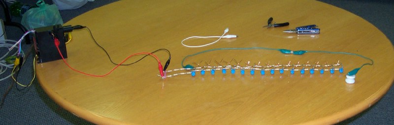 Finally for now, here are some pictures of the test setup, and the thread like streamers from near the maximum discharge length, sorry it is so noisy, there was a severe lack of light. I think I've hit a scalability limit with the number of stages and the charging resistance, perhaps inductive charging is worth the (large) effort? Maybe a I can score a quantity of good quality chokes on eBay and try it out...