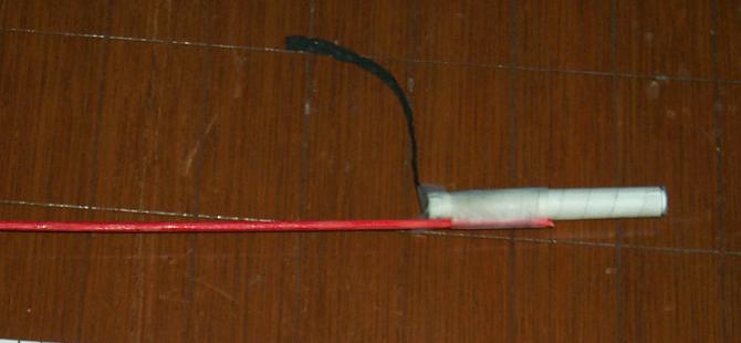 The case was 80 gsm photocopy paper, wound on a BBQ skewer, although much fatter than the ones I used for the stabilizer stick, about 4 mm in diameter. The overall length was 60 mm. The nozzle was compressed cat litter, and the bulkhead was paper wadding and hot melt glue.