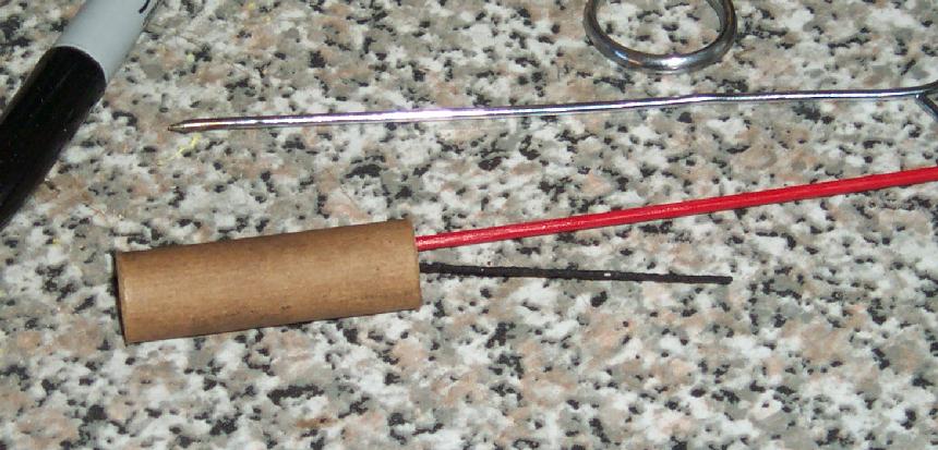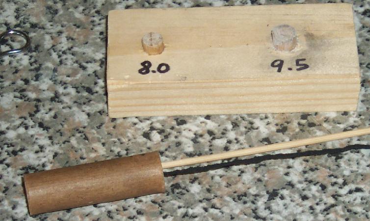 Two motors, a test of the 9.5 mm ID, 50 mm long tubes. Both were rammed with RP on a nipple alone, the cores drilled out with different diameter drills (1.8 mm and 2.5 mm) to tune the motor.