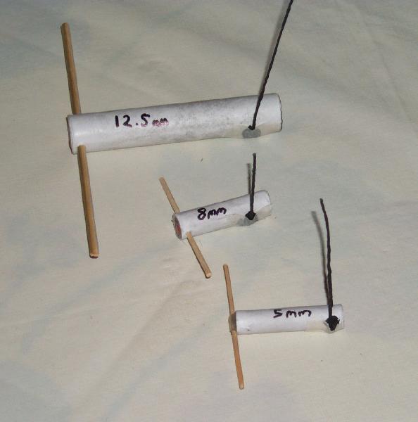 Three helicopter devices, each of a different ID to test various design parameters. Each was charged with straight meal propellant, hot-melt and wadding end plugs, and meal-NC primed blackmatch fuses covered with a little masking tape to allow reliable ignition on wet ground. All had a 45 degree down thrust vector, 1.8 mm nozzle holes for the 5 mm and 8 mm ID devices, 2.5 mm for the 12.5 mm ID device.