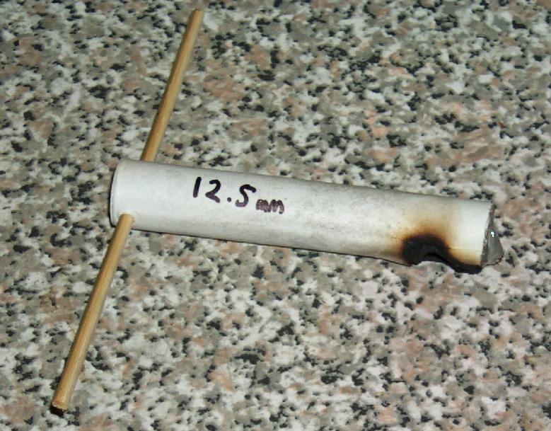 The 12.5 mm device was a poor performer. It took off with great acceleration, but started to slow shortly after. It peaked about 30 metres up and came back down about 30 metres out onto the beach. It burnt for several seconds after landing. On recovery the nozzle hole was found to be greatly enlarged. No doubt this caused the poor performance, a conical clay end plug will be used in future.