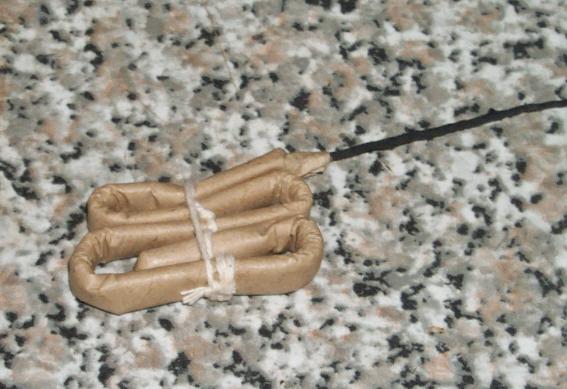 A piece of 5 mm ID match pipe was closed at one end, filled with -20 mesh KP burst, then softened in a wet rag. I didn't have a jig for the folding, so I just did it by hand, tying off each bend as I went.