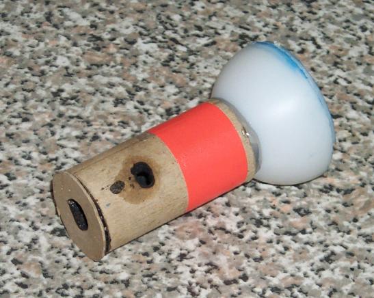 The shell was filled with my experimental KP/Zinc stars, each pumped to 5 mm diameter and length, meal primed. The burst was largely -20+40 mesh pulverone, but I added some -40 mesh pulverone to make the shell slightly over-full for tight packing.
