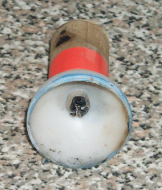 The bottom half of the shell was still attached to the motor. The break had happened more or less completely at the joint, with only a small piece being torn from the lower half's rim. Clearly the solvent didn't weld the joint properly, I'll try xylene next time. The bottom half was in fairly good shape generally, only a few brown spots and melting near the join. The central passfire and delay section was completely burnt away however.