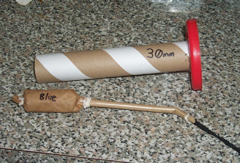 Kraft bag tied off with clove hitches. Lift of 10 g of -20+40 mesh pulverone. Ball of wadding instead of chipboard disks as an experiment in expedient construction. 10 g of 8 mm pumped KP organic blue stars, meal primed. Quickmatch leader with 25 mm of exposed match into the stars, about 100 mm of exposed match at the other end for delay.