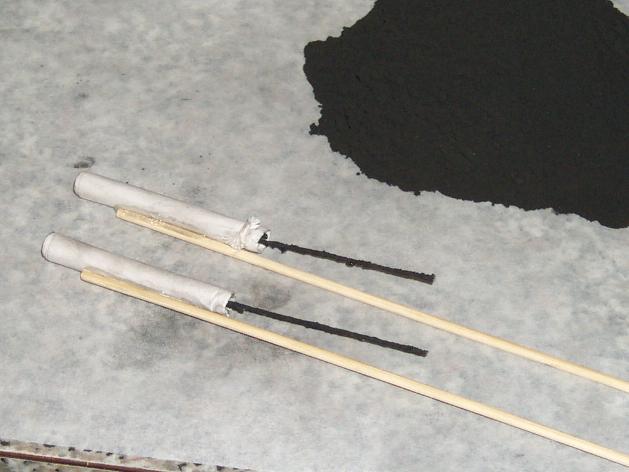 Both devices were dry rolled from calculator tape paper, 50 mm wide. A total for 5 turns was made, the last turn pasted with PVA. The nozzle of one device was formed by choking the case with a piece of string, the other was crimped closed.
