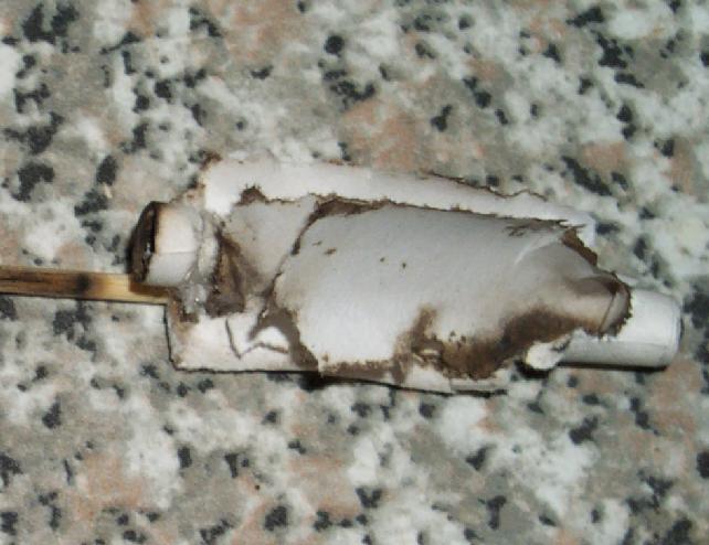 The choked device was tested first, it exploded with a sharp report. The case was shreaded from just above the choke to where the hot-melt glue stopped, basically the entire length of the grain. The hot-melt plug was blown out completely taking a fragment of the case with it, the innermost layer of casing. As the casing was dry rolled this kind of failure was not unexpected, and in fact a much eariler device failed in exactly the same way, but its propellant was much faster burning.