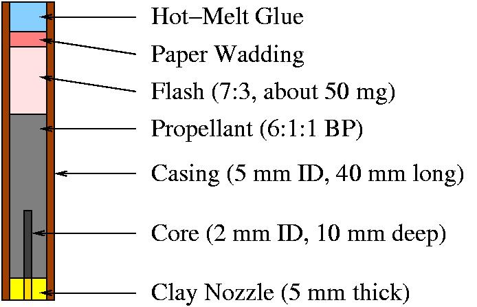 All five were made identically. Wet rolled A4 80 gsm thin paper casing, 5 mm ID, 40 mm long. Propellant of 6:1:1 blackpowder. 5 mm thick clay nozzle. 25 mm of propellant rammed well in 5 increments. Nozzle and core drilled with a 2 mm drill, 15 mm from bottom of rocket (10 mm into the grain). Bulkhead seal of hot-melt glue.