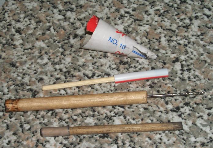 Note the tooling photo. I made a simple adjustable scoup from a piece of soda straw, large bamboo skewer, and sticky tape - in rather the same manner as my previous micro star pump. The 2 mm drill was attached to a piece of dowel for easy hand-drilling, and a simple funnel was made from a scrap of sparkler packaging. The stick-end of the powder scoup is used to encourage the powder out of the funnel and into the case. In the past I used a seperate wire tool, but just reversing the scoup is faster than picking up another tool.