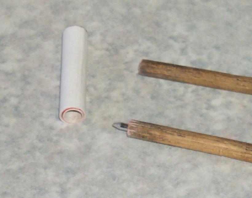 The device was fused with a piece of blackmatch that was bent over several times at one end to hold it into the empty end of the tube once inserted.