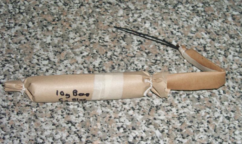 I suspect the 10 g unit's inserts detonated inside rather than being blown blind. Its report was enormous, louder than the 15 g one. Its stars were all blown blind. The purple thing on the video is pieces of the quickmatch, I used KP Purple colour composition fuse to make the match.