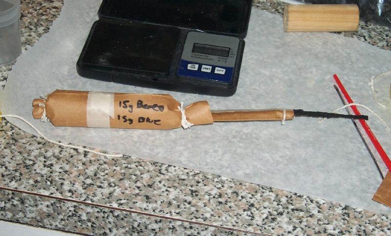 They were all made the same internally, a tied-off kraft bag, benzolift in the bottom, a ball of paper-towel wadding, the stars/inserts on top, then a length of quickmatch poked into the stars and the top tied off around the match.