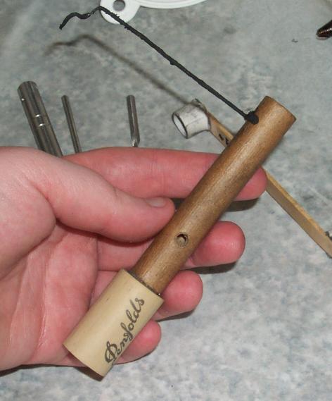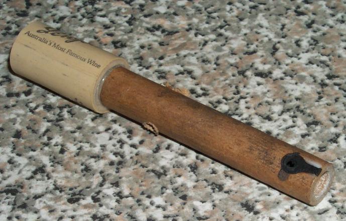 The device was fused with blackmatch held in place with meal/NC priming paste. A 5 mm hole was drilled through the empty part of the tube to take an axle for rotation. A plastic cork was hot glued to the end of the tube for balance.