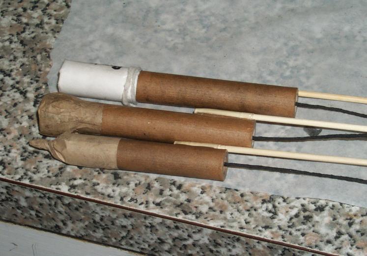 All three had a conventional bamboo kebab stick for the stabiliser and a blackmatch fuse, although this time I did not use any priming to glue the fuse in, I just bent over about 10 mm of its length and forced it up the nozzle where it stayed by friction quite well.