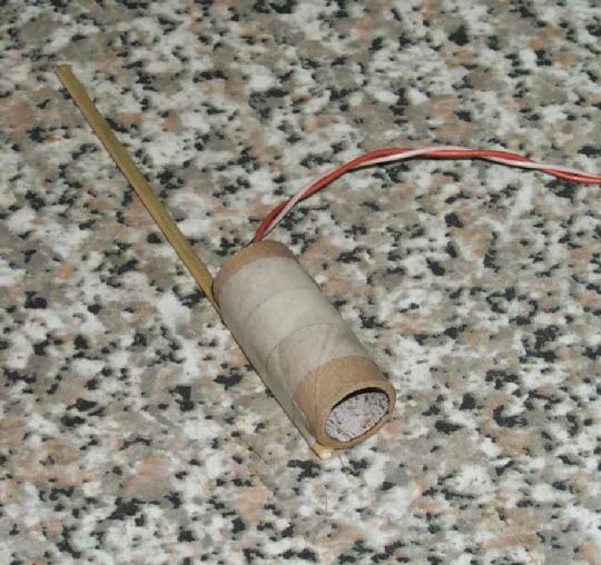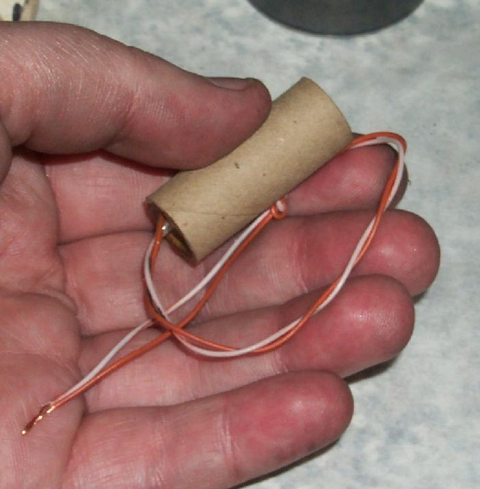 A very simple mine-like device. A 12.5 mm ID spiral tube, 40 mm long, plugged at the bottom with a paper plug and hot-melt glue. An e-match was carefully positioned before the plug and hot-melt glue, with its leads passing to one side of the plug and through the glue to make a gas-tight seal and robust lead restraint.