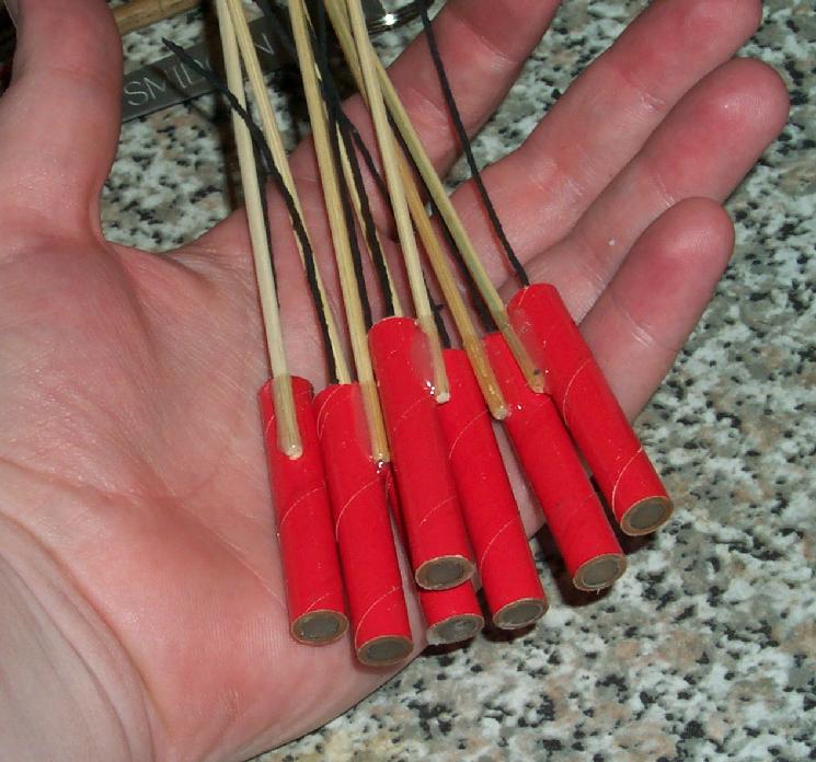 The tubes were clay choked and charged half-full with the propellant composition. Then most of the remaining space was filled with loose Benzoate Whistle as a report charge. The top was sealed with a piece of wadding and a drop of hot-melt glue.