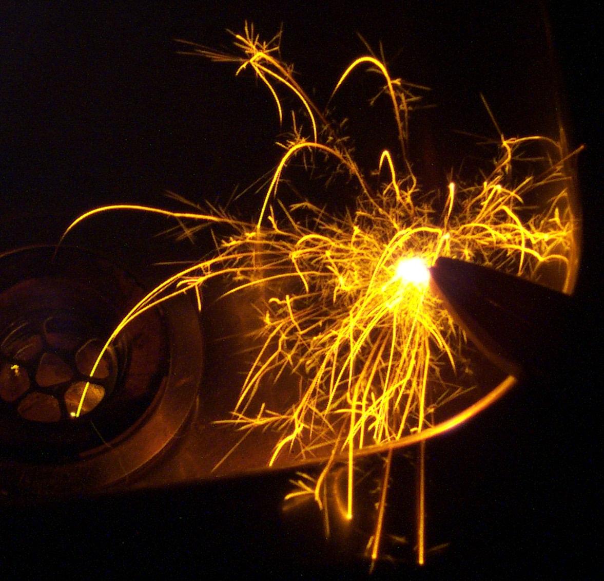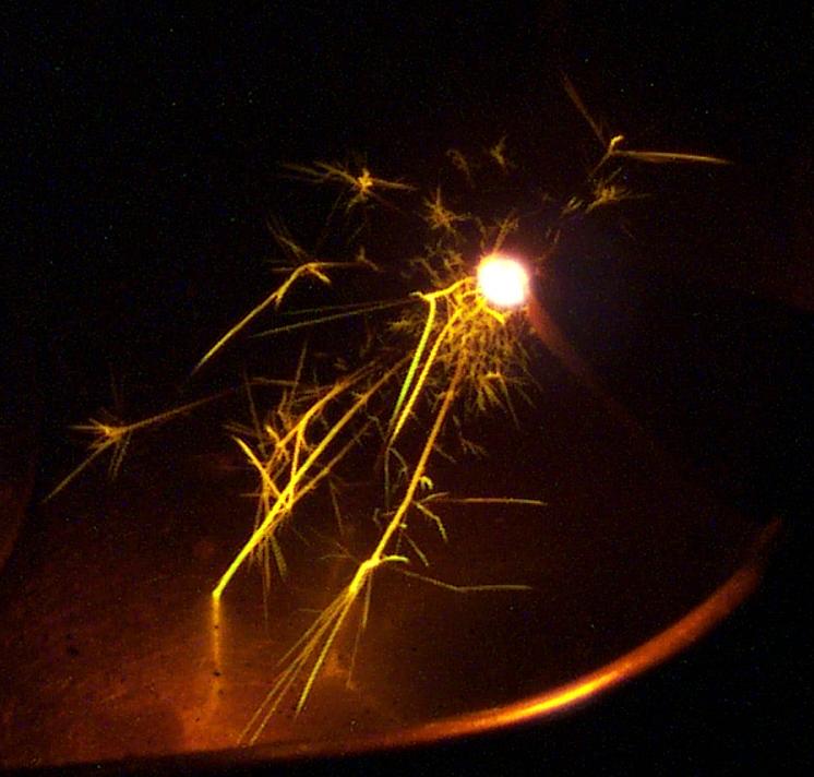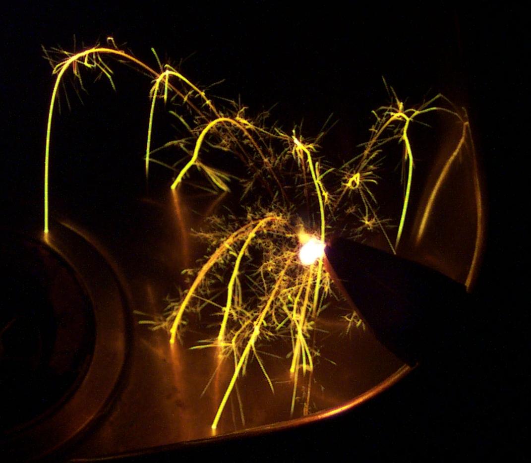 Many of the brighter trails of sparks are seen changing direction as a result of smaller masses ejected at high speed. The fine streaks of the small explosive events during fall make a lace-like effect on some sparks. Many sparks are even seen to explode completely into numerous smaller sparks which fan out in every direction.