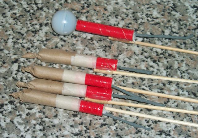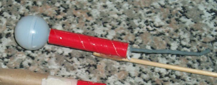 The stick was a bamboo BBQ kebab skewer (full length/thickness, no splitting) hot-melt glued in place. The fuse was a short length of Zinc match held in place with a small ball of paper wadding.