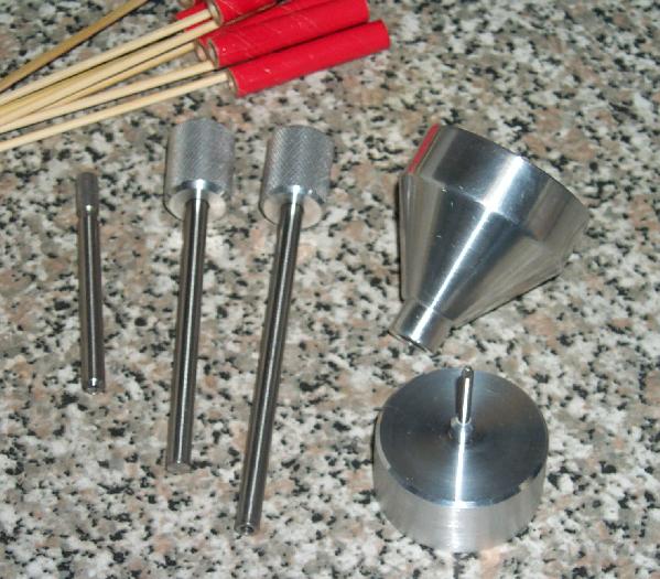 I recently got Rich Wolter's bottle rocket tooling set, it is a very nice piece of kit to use. I asked him to make me a funnel and wire set to match the pyrotube.com 1/4" tubes in addition to the $48 bottle rocket tooling, I was really blown away when I first used it, makes building these bottle rockets quick and easy.