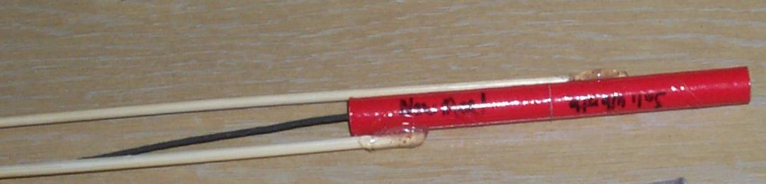 Each stage had its own independent stabilizer stick, hot-melt glued in place. The first stage was fused with blackmatch. The stick for the first stage was placed in the launch tube, with the second stage stick laying freely alongside the tube.