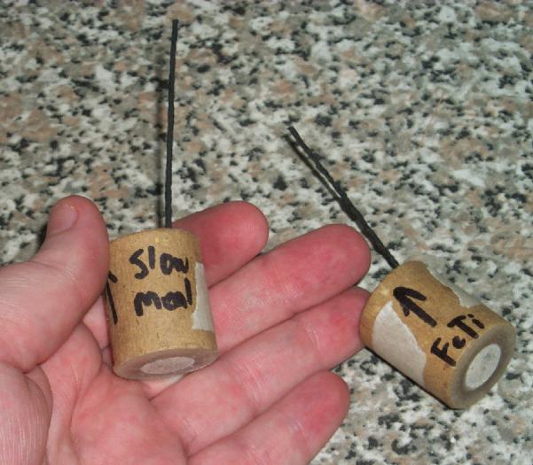 Two 12.5 mm flying hummers (aka single nozzle z-bomb style tourbillions). Skylighter hummer casings, 1/2" ID, 1.5" long. One charged with my batch of Contaminated Meal, the other with FeTi Driver composition.