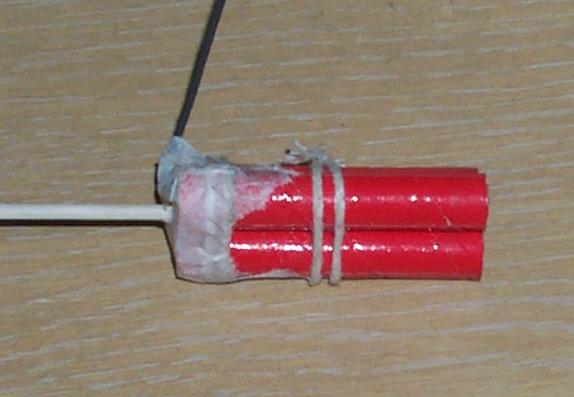 All three were tied around a central stick using two clove hitches. Each motor was fused with blackmatch, and the matching drawn together. Some kitchen paper was pasted over the ends of all three motors and one length of blackmatch brought out for ignition.