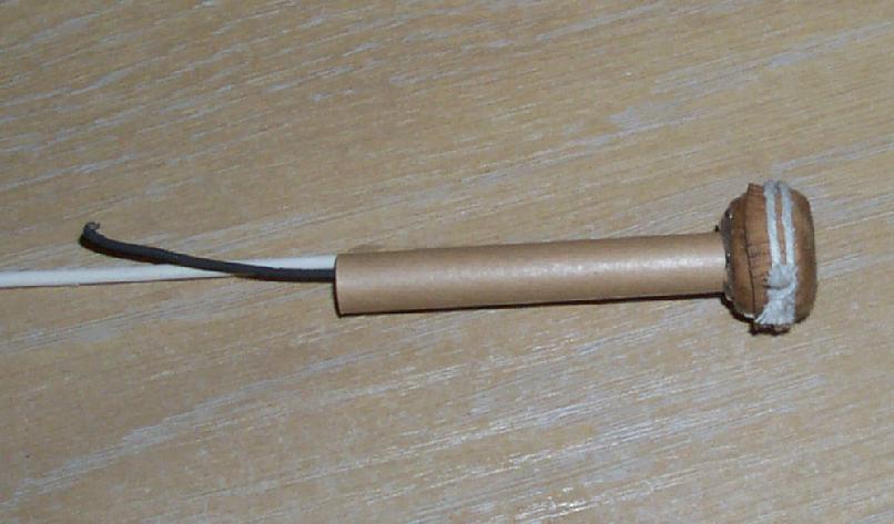 The header was a 3/4" skylighter cup set. Inside four pumped Winokur 20 stars were squeezed into a ring in the inner cup. The center of the base of this cup was punched for a piece of blackmatch and the match glued in place with meal/NC paste. The central space between the four stars was filled with loose MgAl Flash. The remaining empty space in the cupset was filled with 6:1:1 pulverone and the outer cup glued on with PVA. A clove hitch was tied around the cupset to hold it tightly closed as it dried.