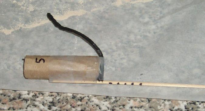 Motor was rammed on mandrel, fused with meal-NS tissue paper fuse, no prime. This motor has misfired on a previous shoot with an experimental fuse (as seen in the picture). Standard medium-length kebab stick for a stabilizer.
