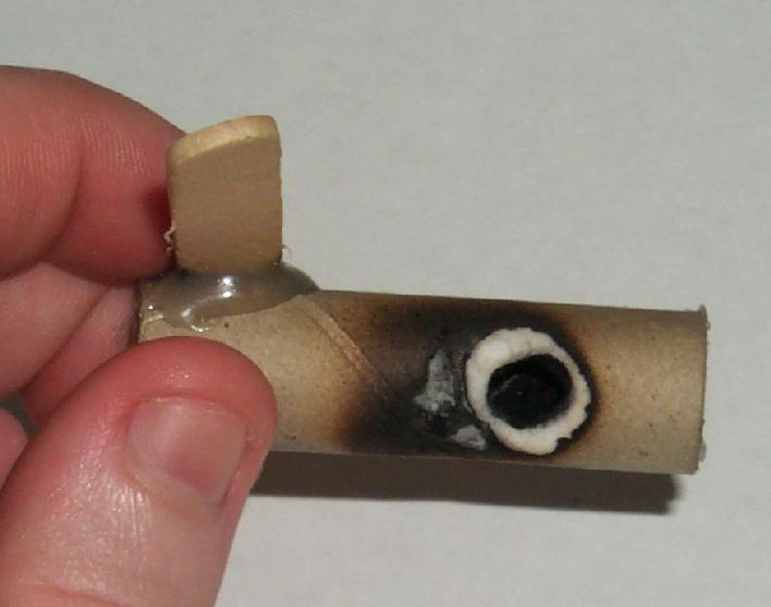 The KN/Sucrose/Gum-Arabic cookie-like propellant I made up was crushed and packed into a 40 mm long cardboard tube, 10 mm ID. The tube is the core from a fax roll. End plugs were made of paper and hot-melt glue, about 10 mm thick.