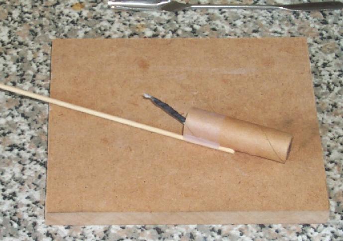 This rocket was made using the core of a calculator paper roll, which is a spiral wound tube about 50 mm long, 8 mm ID, and with 2-3 mm walls.