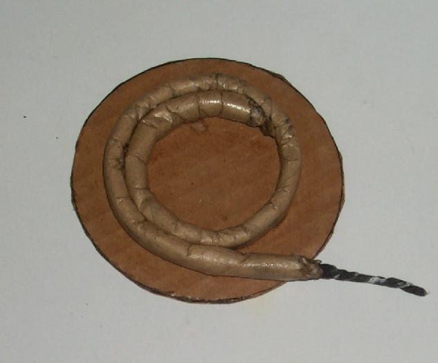 Once the tube dried to slightly tacky I stuck it to a cardboard circle, painted in PVA to harden it. The tube was given 2 days of sun drying before test. The fuse was my standard meal/NC twisted tissue type.
