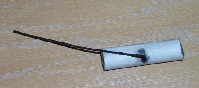 A ground spinner item, made like a hummer. Rather thick case, 5 mm ID, 13 mm OD. 40 mm long. End plugs of paper wadding and hot-melt glue. Vent hole drilled using a 1.8 mm drill.
