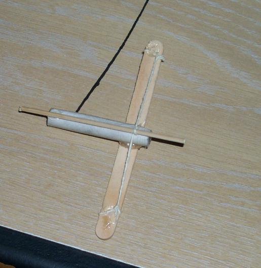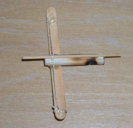 A paddle-pop stick for a stabliser bent up at the ends by steaming, but held more permanently using some cotton string and a bamboo stick to twist it tight. A small dob of hot-melt glue was used to give it a bearing point.