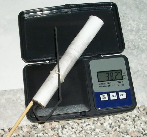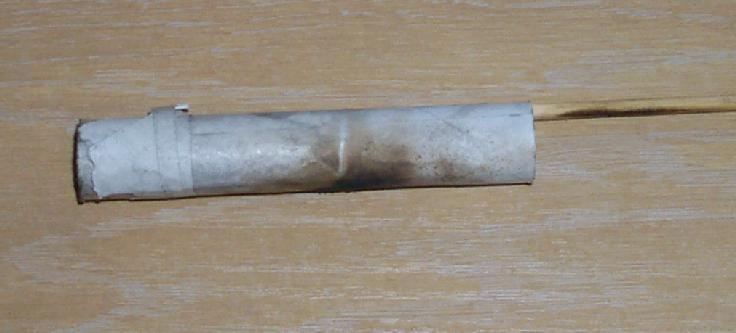 The payload was contained in a pasted nosing extending 40 mm beyond tube. A teaspoon of pulverone as a break charge, some Granite stars, a small amount of paper wadding and a triangle fold to close the top.